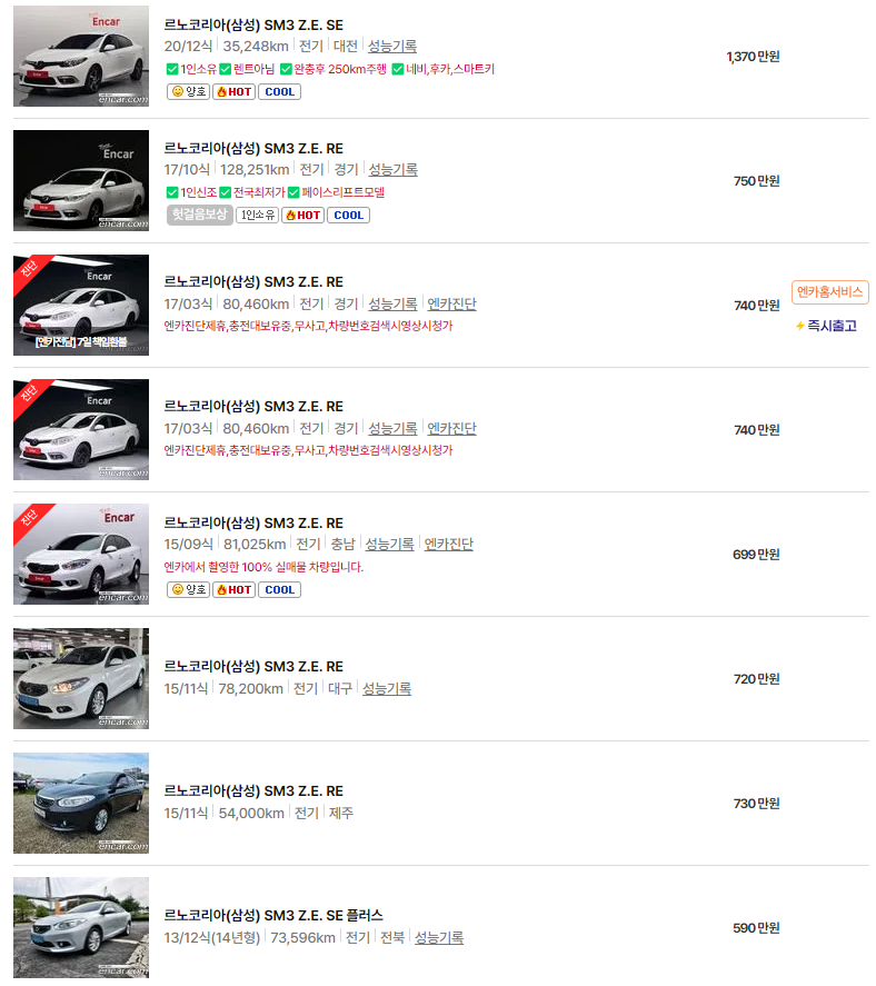 SM3 Z.E.(13~20년식) : 342 ~ 1,490만원