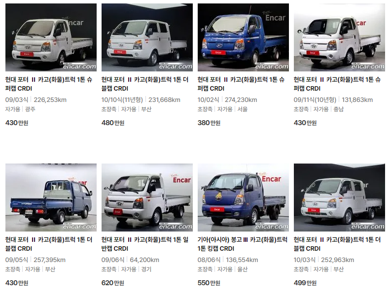 여기까지 1톤 화물차의 중고차 가격을 알아보았습니다. 1톤 화물차 중고차 시세가 궁금하셨던 분들은 위 가격표 또는 엔카, Kcar, KB차차차와 같은 중고차 시세 사이트를 참고해서 구매하시면 좋을 것 같습니다.