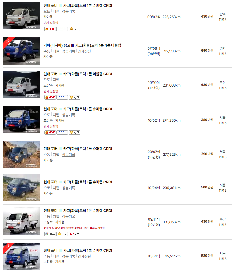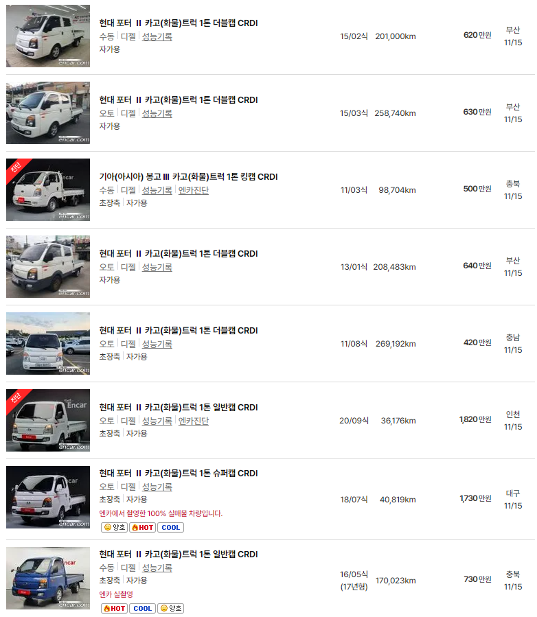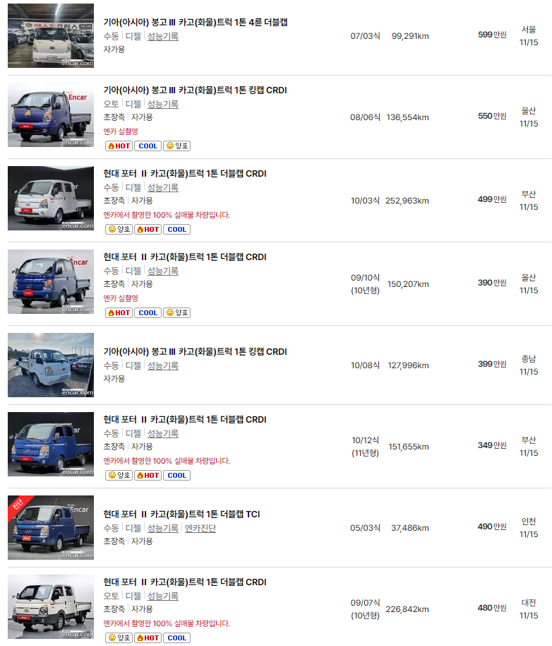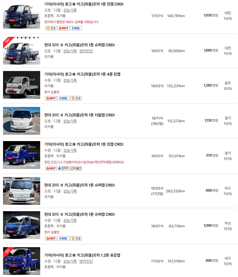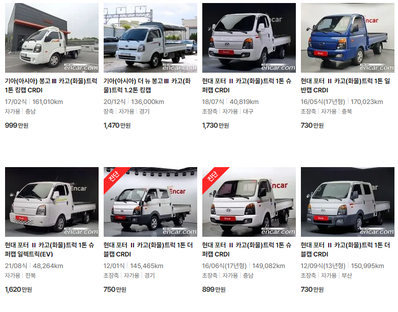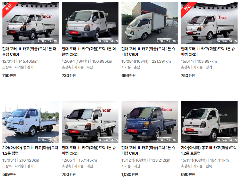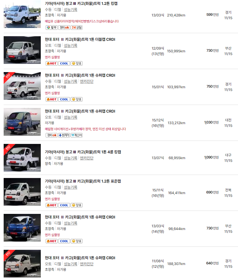 1톤 화물차 중고차 매물은 여기에서 확인이 가능합니다. 다양한 연식과 키로수의 중고 매물을 가급적 직접 보시고 비교해 보시기를 추천드립니다.